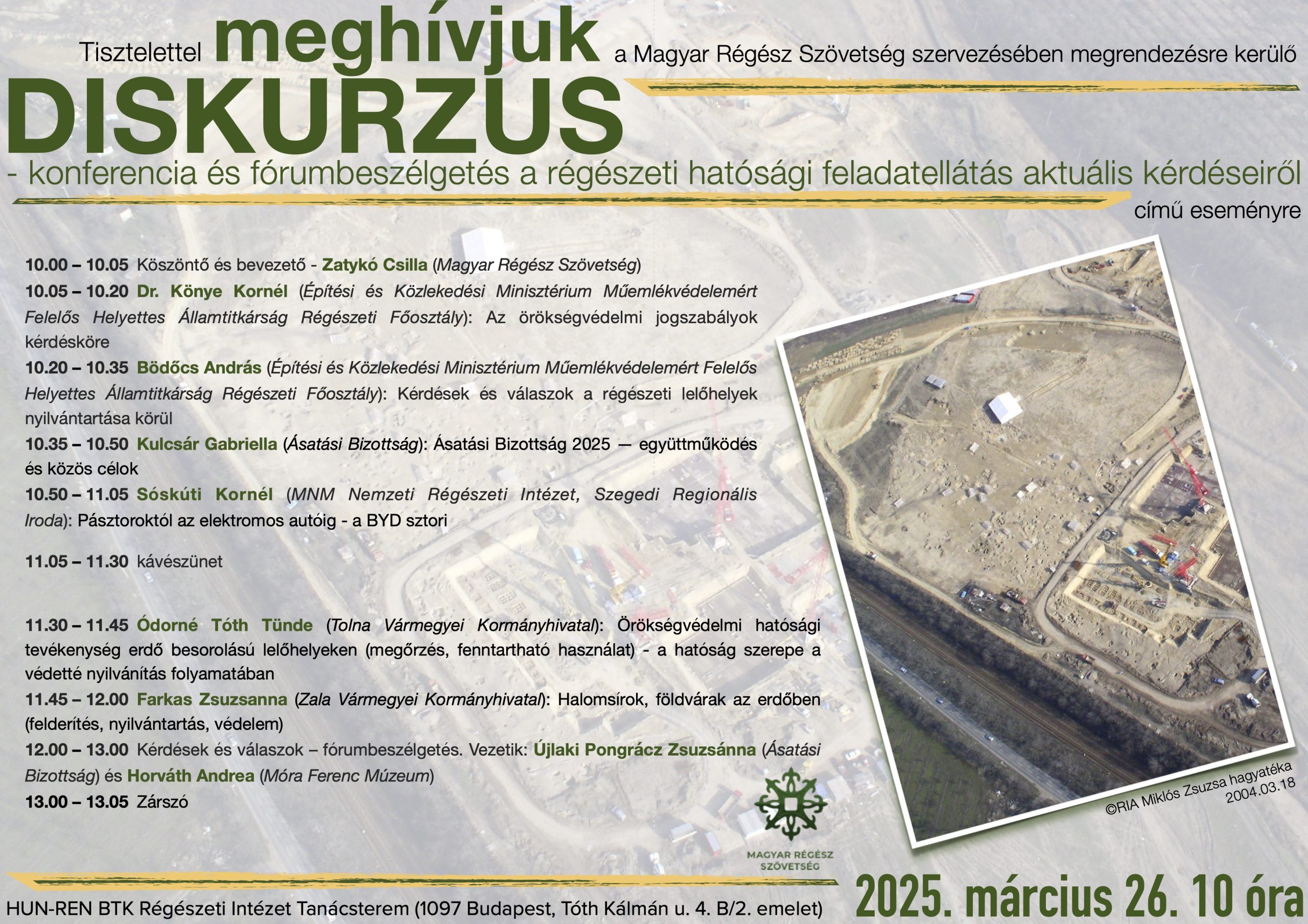 Diskurzus – konferencia és fórumbeszélgetés a hatósági feladatellátásrólMÁRCIUS A Magyar Régész Szövetség által 2025. március 26-án első alkalommal szervezett „Diskurzus – konferencia és fórumbeszélgetés a hatósági feladatellátásról” című rendezvényt élénk szakmai érdeklődés kísérte. Az előadások számos aktuális kérdést érintettek: szó esett többek között az Ásatási Bizottság munkájáról és jogszabályi környezetéről, a nagyfelületű feltárások örökségvédelmi szempontjairól, az erdei régészeti lelőhelyek hatósági és szakmai kihívásairól, valamint az erdei halomsírok és földvárak kutatási lehetőségeiről is. Az előadásokat jó hangulatú fórumbeszélgetés zárta, amely lehetőséget teremtett a hatósági feladatellátás gyakorlatának és kihívásainak nyílt, szakmai megvitatására.